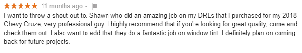 I want to throw a shout-out to, Shawn who did an amazing job on my DRLs that I purchased for my 2018 Chevy Cruze, very professional guy. I highly recommend that if you're looking for great quality, come and check them out. I also want to add that they do a fantastic job on window tint. I definitely plan on…